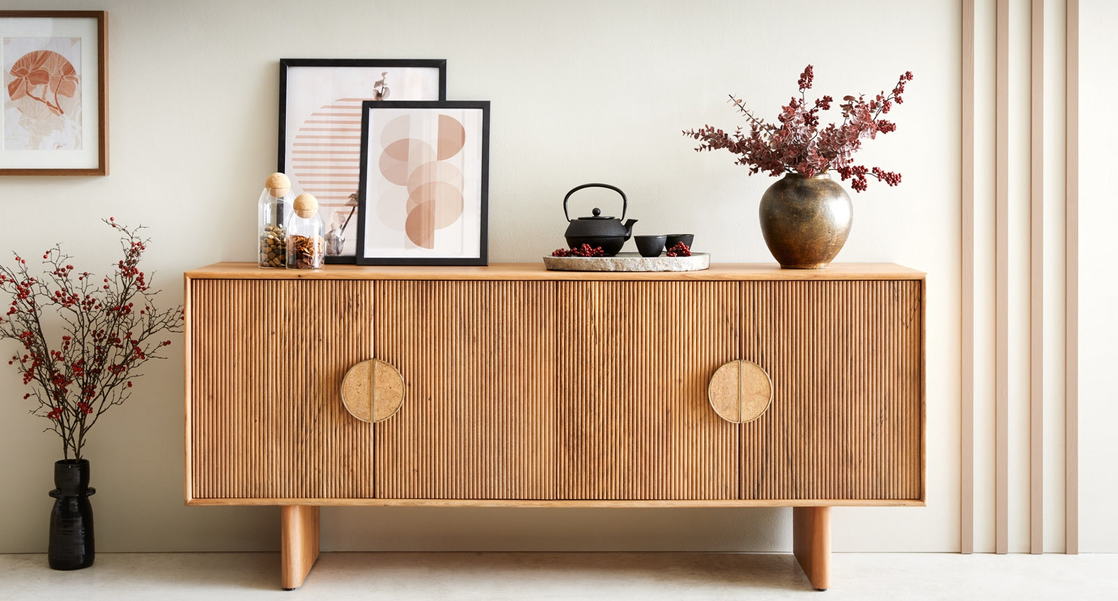 - Surimu Sideboard: Made from light acacia wood with cork handles, the Surimu Sideboard combines practicality with style. Its natural textures and minimalist design make it a perfect addition to dining or living spaces, offering ample storage while enhancing elegance.